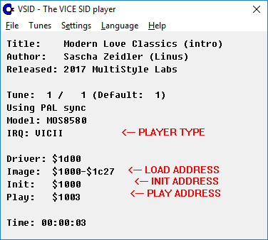 How the player works:To update the player independently of the main loop we point the hardware interrupt ($0314-$0315) at our music player start point. This gives us a regular update every vblank (50fps for PAL, 60fps for NTSC) so we have a steady tempo. As we're using the interrupt in freewheeling mode rather than hitting a specific raster line, it will be triggered wherever the raster beam is when the interrupt is called. This usually isn't a good idea for things you want to happen at a specific time, however for us this is actually useful later in the player as we'll use the raster beam position to pick values.